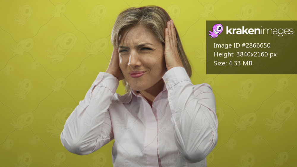 Blonde woman covers her ears with both hands against a yellow studio wall; frustration isolation panic.