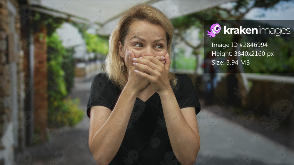 Blonde woman covers mouth with both hands on street lined with trees and stone wall facade; surprise.