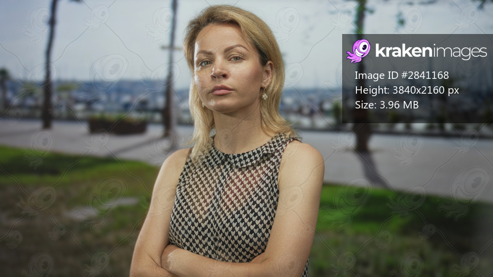 Blonde woman crosses arms while standing in a sunlit flower field under blue sky above green grass; determination.