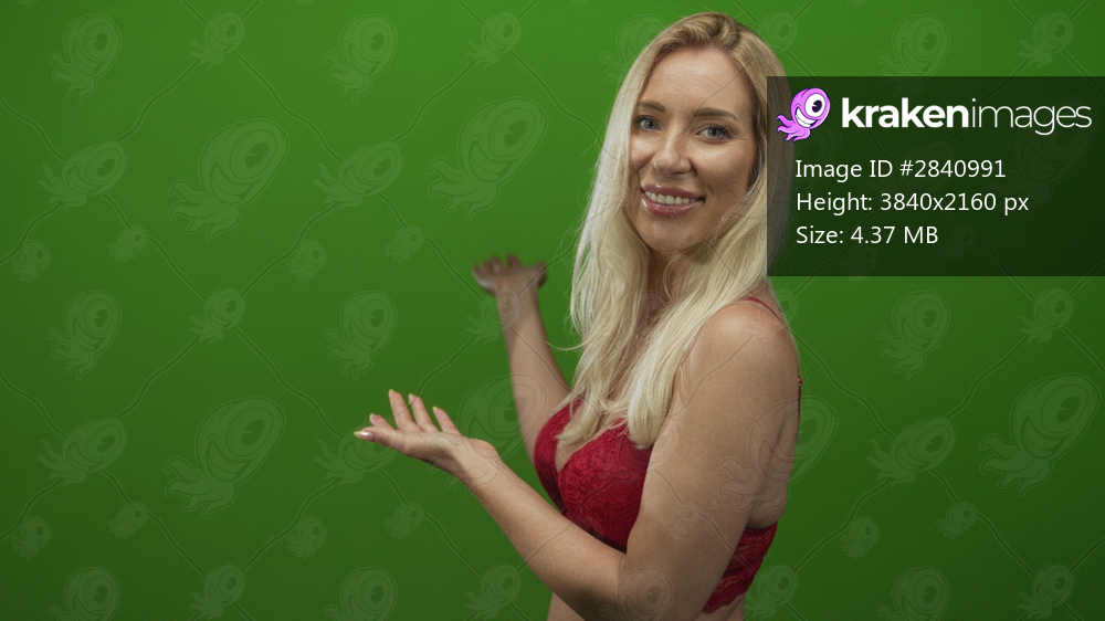 Blonde woman displays open hands palms up gesture while smiling in green studio space wearing red lace bra; invitation joy.