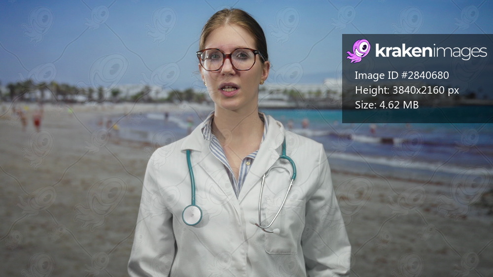 Blonde woman doctor wearing a white coat and teal stethoscope stands facing the camera under bright lighting in studio; serene professionalism.