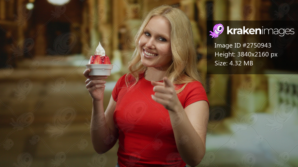 Blonde woman enjoying strawberry ice cream in a gallery setting, showcasing artful surroundings with a joyful expression.