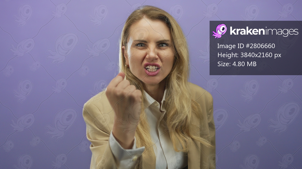 Blonde woman expressing anger with a clenched fist against a purple background, showcasing strong emotion and intensity.
