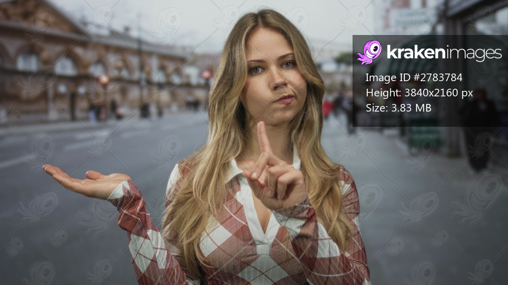 Blonde woman extends open palm forward on a busy urban street while tilting her head in a questioning manner; uncertainty doubt.