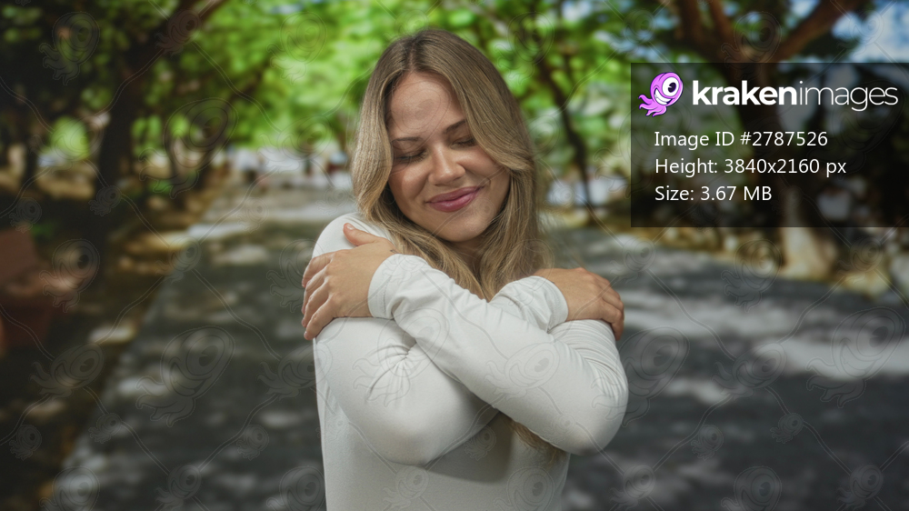 Blonde woman with eyes closed and gentle smile hugs her shoulders in green park; self care comfort wellness.