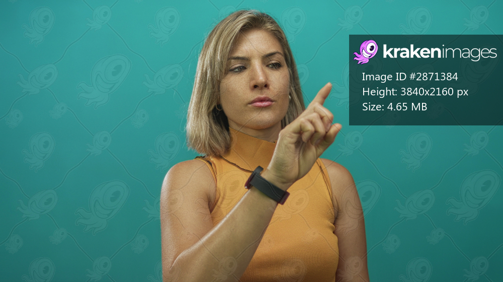 Blonde woman with freckled skin wearing smartwatch points finger at wrist against turquoise studio wall; thought.