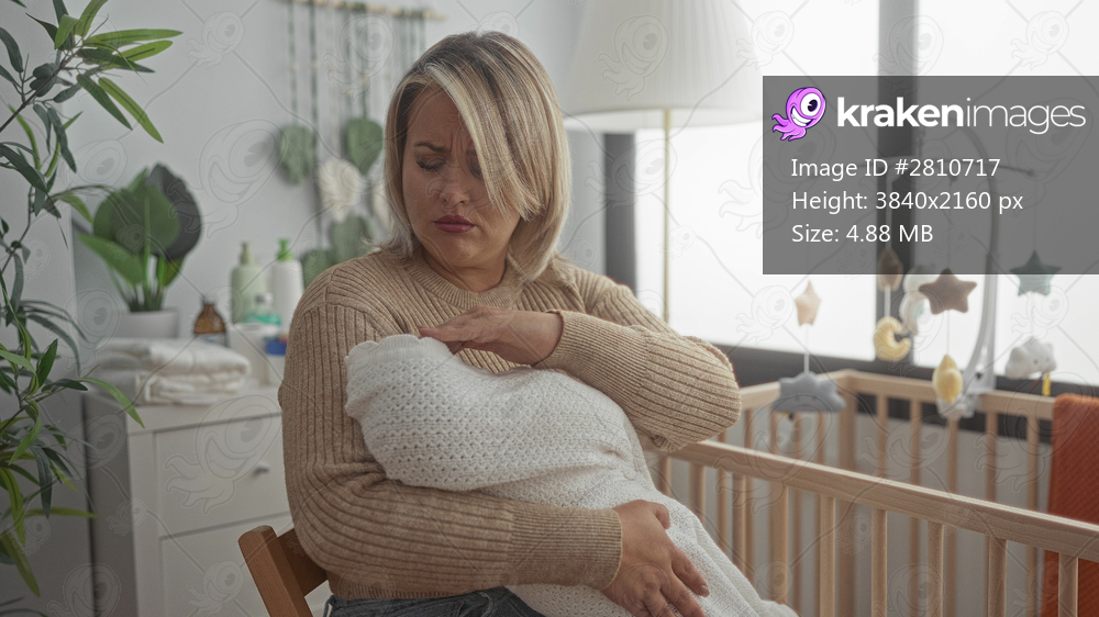 Blonde woman gently cradles baby head in light nursery with wooden crib lamp and potted plant; comfort bonding.