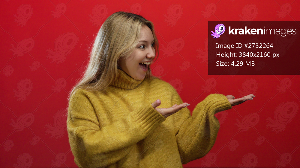 Blonde woman gesturing happily on an isolated red background wearing a yellow sweater, expressing joy and excitement with open hands.