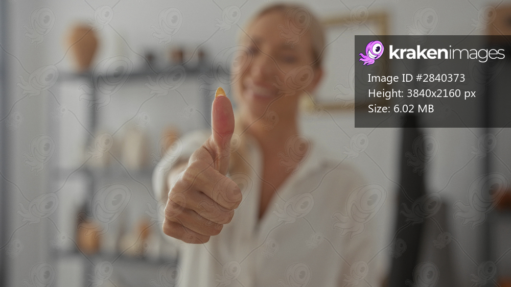 Blonde woman gives thumbs up gesture while smiling at camera in artisan studio; approval positivity confidence.