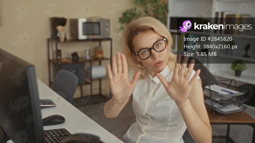 Blonde woman with glasses and hands raised toward computer monitor at office desk, pushing away barrier; refusal.