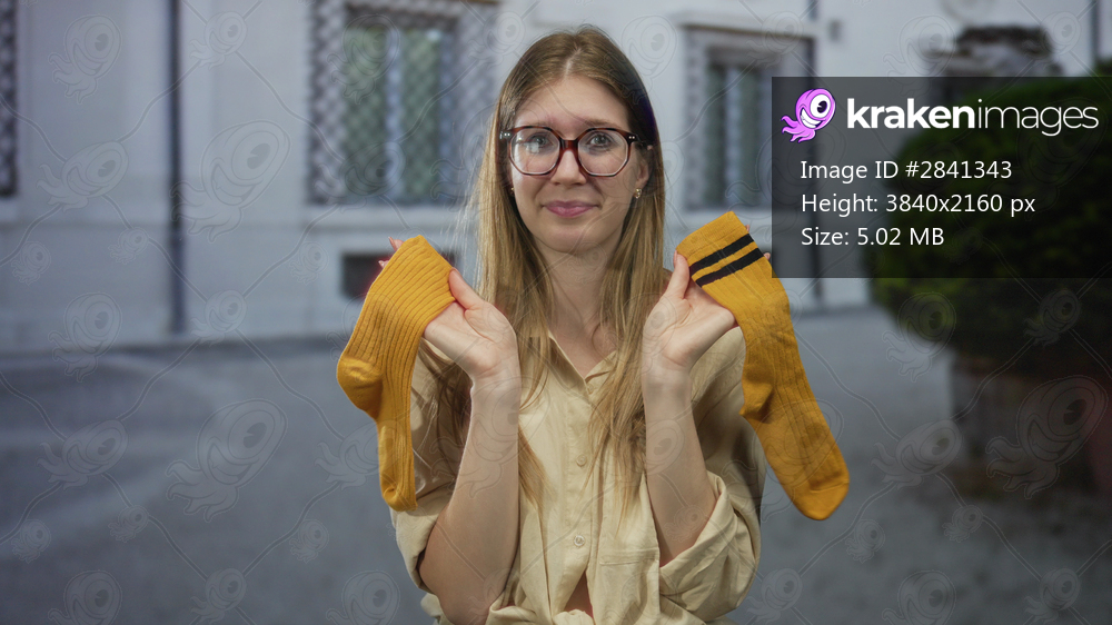 Blonde woman with glasses holding yellow socks with both hands in front of white building facade; uncertainty.