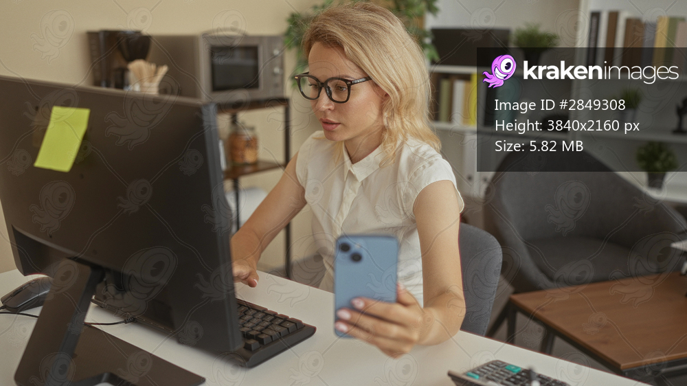 Blonde woman with glasses holds smartphone at white computer desk in bright office; concentration efficiency.