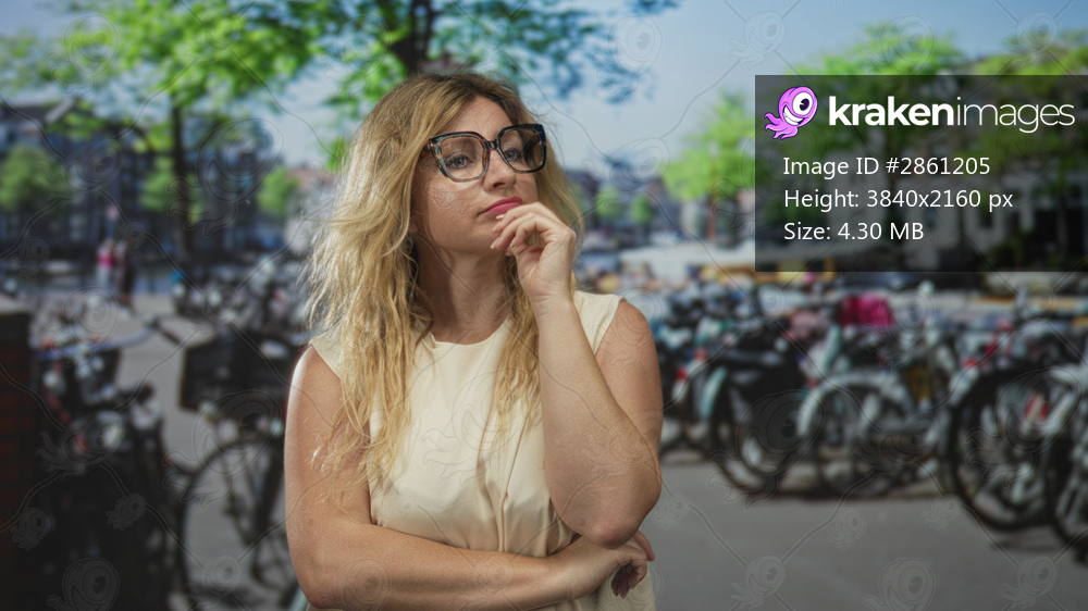 Blonde woman with hand on chin and crossed arms at busy bike parking on a city street, wearing glasses; contemplation.