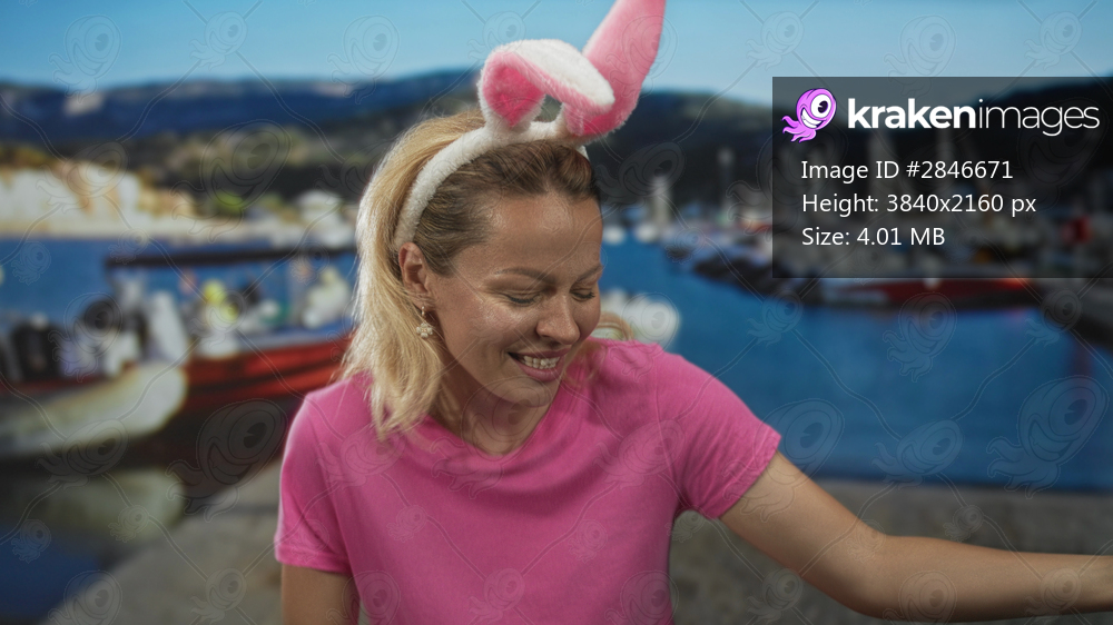 Blonde woman hand strums air at sunny seaside port with bunny ears and pink shirt near docked boats; playfulness.