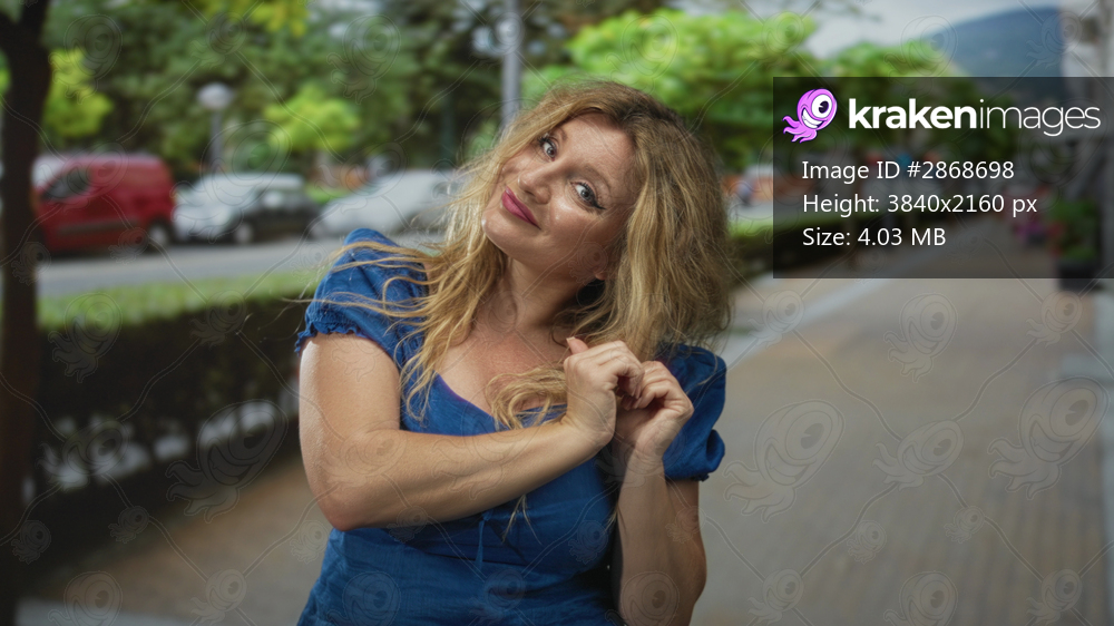 Blonde woman with hands forming heart gesture on a city street sidewalk near parked cars and trees; affection.