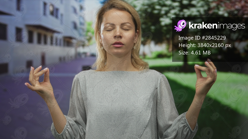 Blonde woman with hands in ok sign on sunlit city street outdoors lined with modern buildings; serenity.