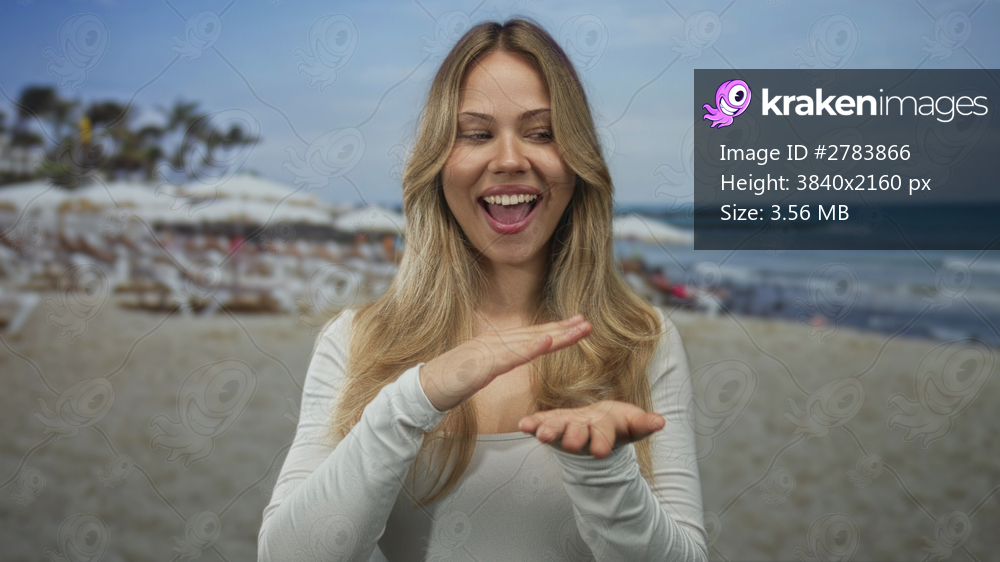Blonde woman hands showing money sign gesture at beach; wealth prosperity playfulness spending vacation.