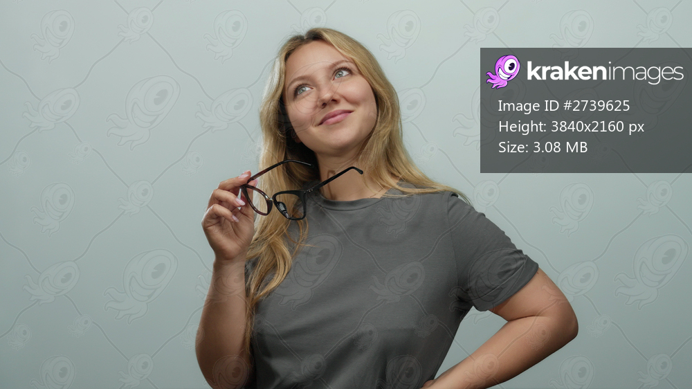 Blonde woman holding glasses in thoughtful pose against white background, wearing gray shirt, isolated in front of a plain wall, representing contemplation and ideas. - Kraken Images