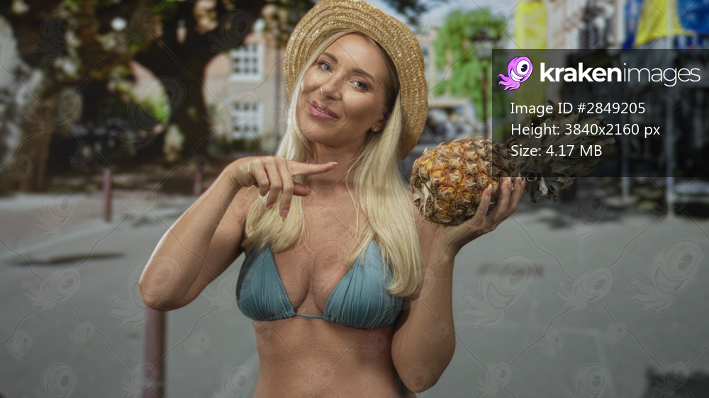 Blonde woman holding ripe pineapple and gently touching straw hat while smiling on sunlit street; summer joy.
