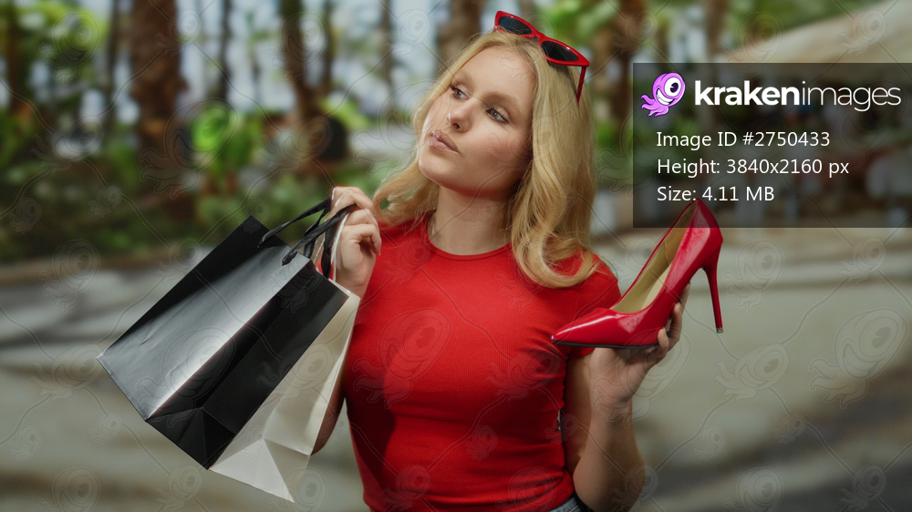 Blonde woman holding shopping bags and red shoe outdoors on city street, wearing red shirt, appearing thoughtful in vibrant, urban setting, exploring retail therapy. - Kraken Images