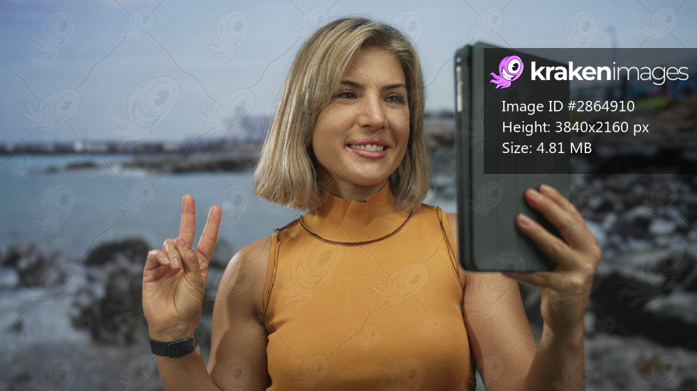 Blonde woman holding tablet shows peace sign in studio overlooking rocky coast on screen while smiling at camera; happiness.
