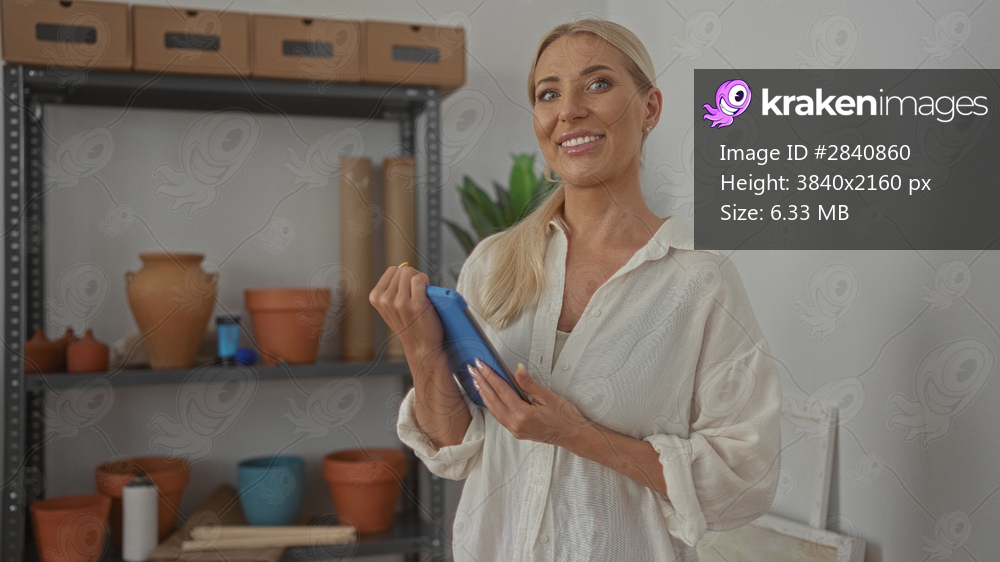 Blonde woman holds blue tablet and smiles confidently in bright artisan studio; creative confidence.