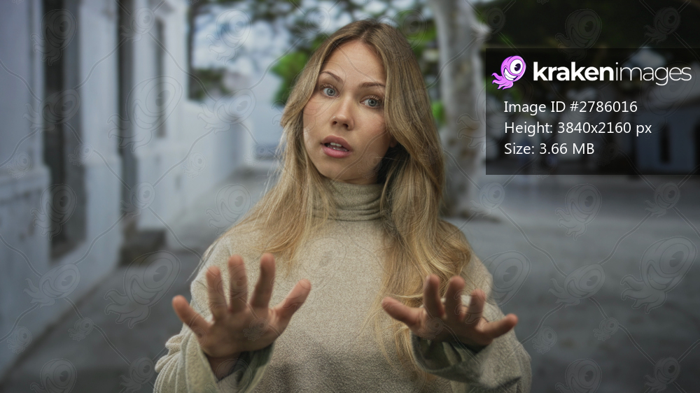 Blonde woman holds both hands up in a defensive gesture on a sunlit urban street; caution hesitation uncertainty restraint.