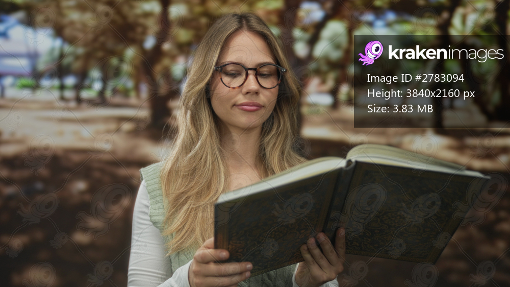 Blonde woman holds open hardcover book with both hands reading under tall oak trees in green city park; calm reflection.