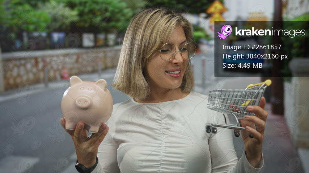 Blonde woman holds piggy bank and small shopping cart on sunny street; saving spending balance optimism.