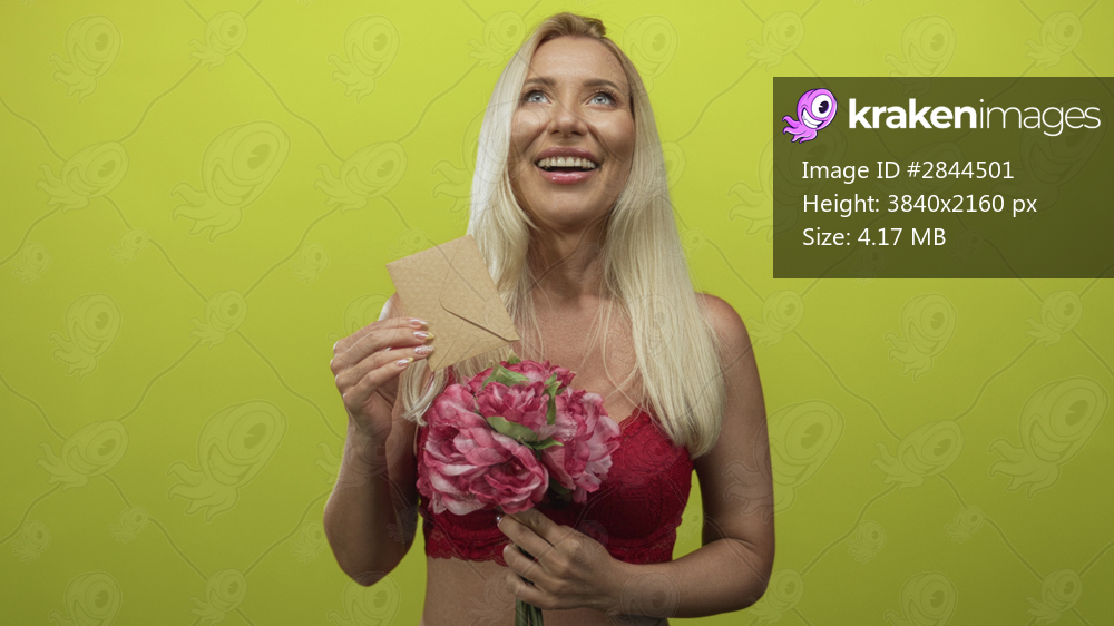 Blonde woman holds pink bouquet and brown envelope with cleavage visible in green studio scene; happiness.