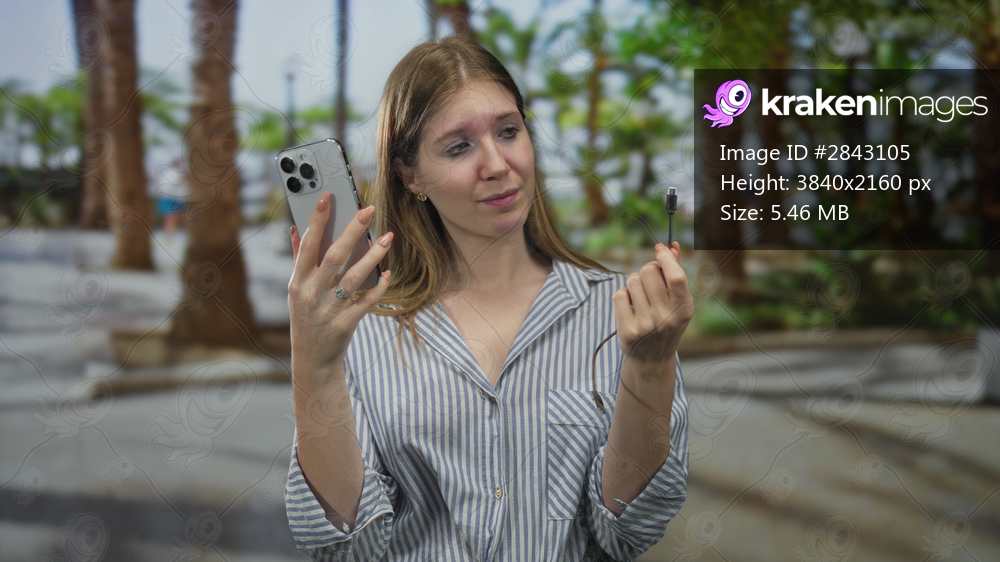 Blonde woman holds smartphone and cable connector at arm’s length in green park amid leafy trees and pathways; confusion.