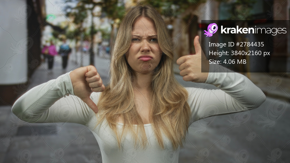 Blonde woman holds up right hand in thumbs up and left hand in thumbs down gesture on urban street; indecision ambivalence.