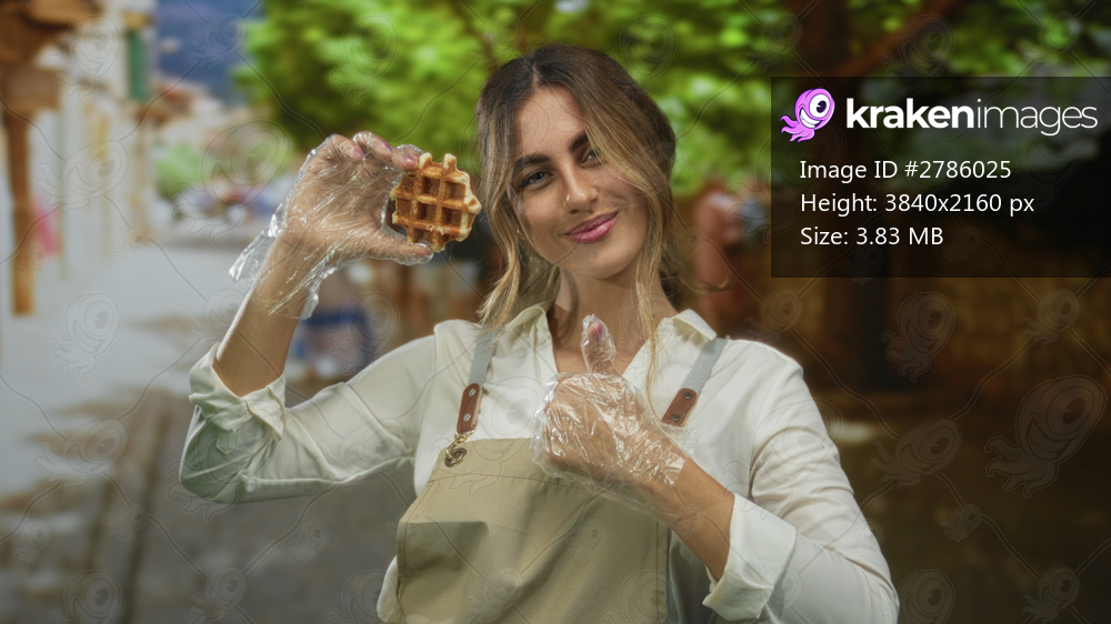 Blonde woman holds waffle in gloved hand and shows thumbs up in cobblestone street; happiness enjoyment satisfaction.