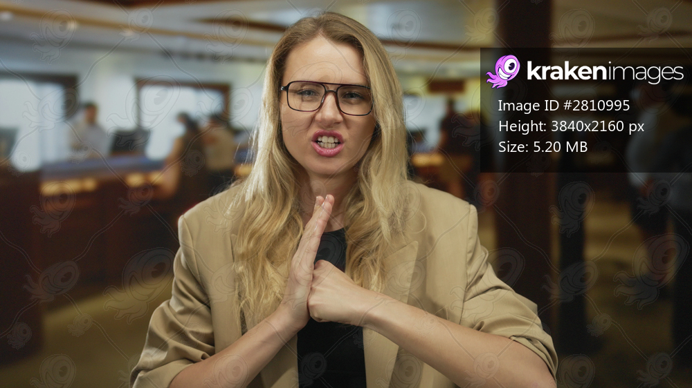 Blonde woman in a hotel angrily gesturing with fist on palm, wearing glasses and beige jacket, standing indoors surrounded by blurred background of people and reception area. - Kraken Images