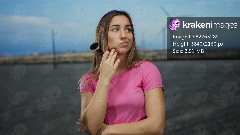 Blonde woman in a pink shirt holds a makeup brush in field with windmills and an overcast sky, capturing an outdoor rural setting with energy elements. - Kraken Images
