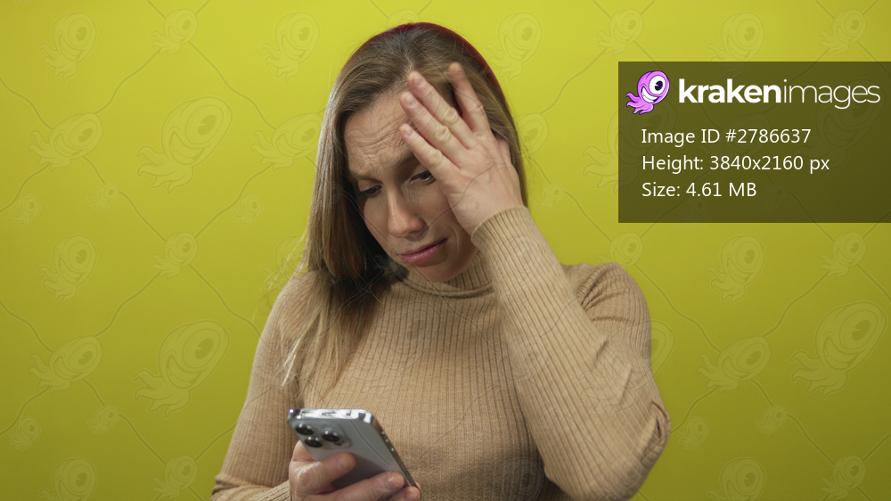Blonde woman in a tan sweater on a yellow background looks stressed while using a smartphone, expressing frustration and neck pain in an isolated setting. - Kraken Images