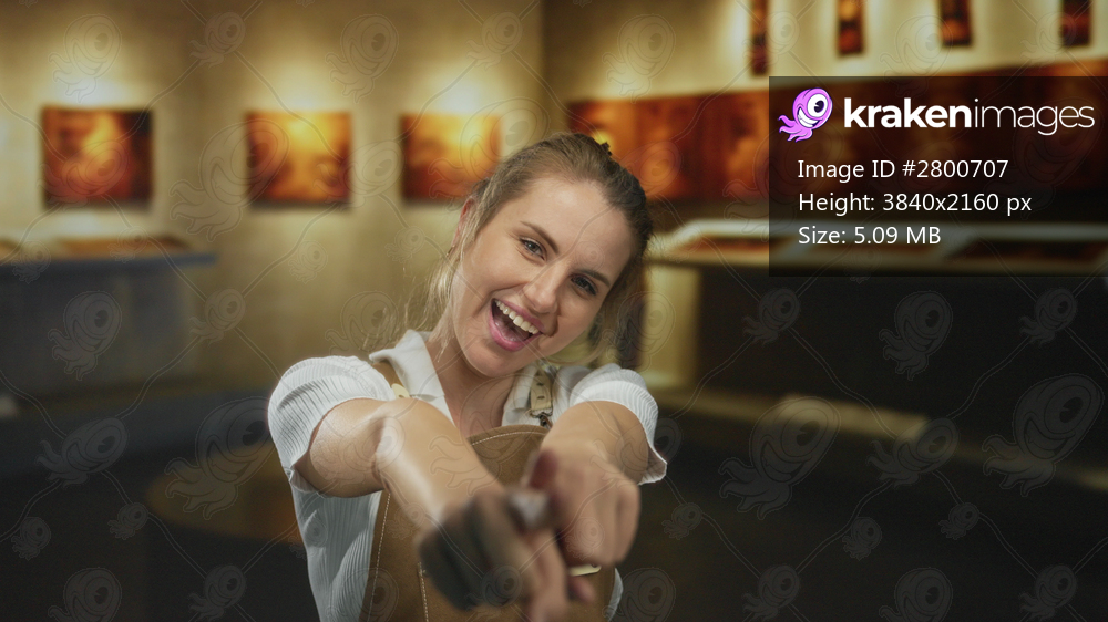 Blonde woman in apron making peace sign and pointing at camera indoors at a museum, showcasing a joyful and playful moment amid artwork surroundings.