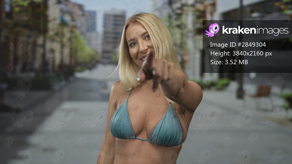 Blonde woman in bikini with exposed cleavage points finger on sunlit city street; invitation confidence.
