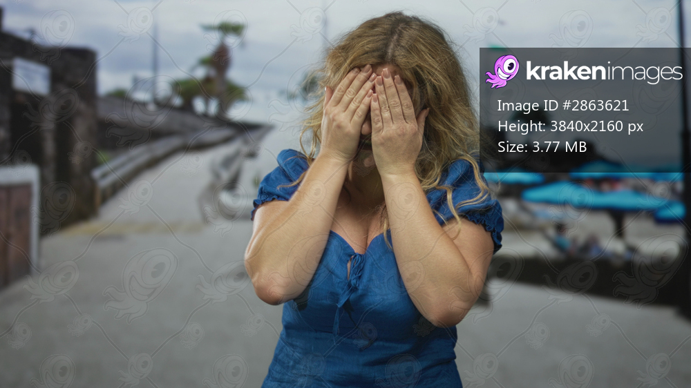 Blonde woman in blue dress with hands crossed on chest and covering face on street near beach promenade, smiling across frames; joy carefree playful.