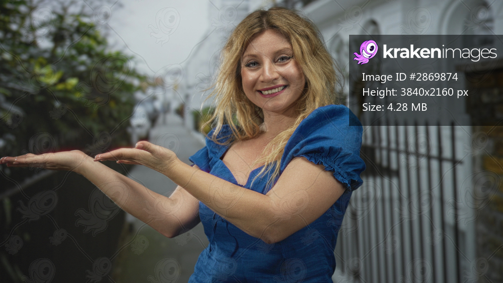 Blonde woman in blue dress with open hands palms up on city street smiling and looking upward; joy gratitude.