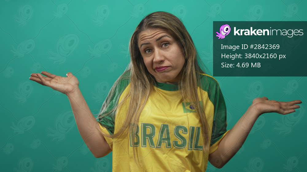 Blonde woman in brasil jersey shrugs hands in green studio with puzzled expression; uncertainty indifference.