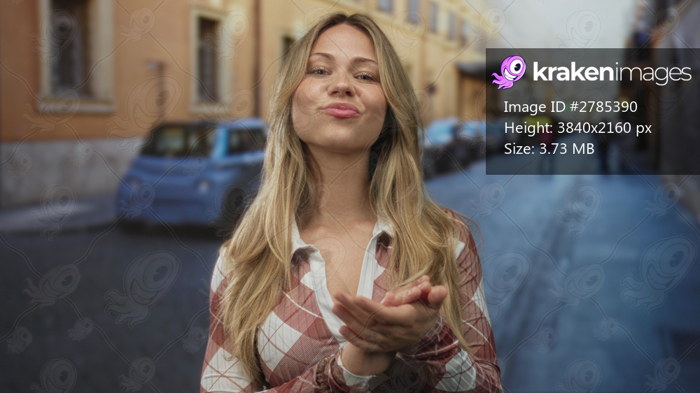Blonde woman in checkered blouse claps her hands with a wide grin on busy street; celebration appreciation joy.