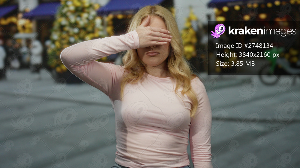 Blonde woman in city street with festive background raises hand and covers eyes, wearing pink, young, outside, urban, cheerful, autumn, fashion, day, posing. - Kraken Images