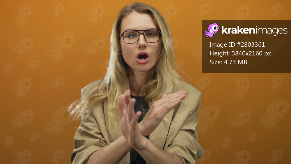 Blonde woman in glasses expressing rejection with crossed arms against orange background.