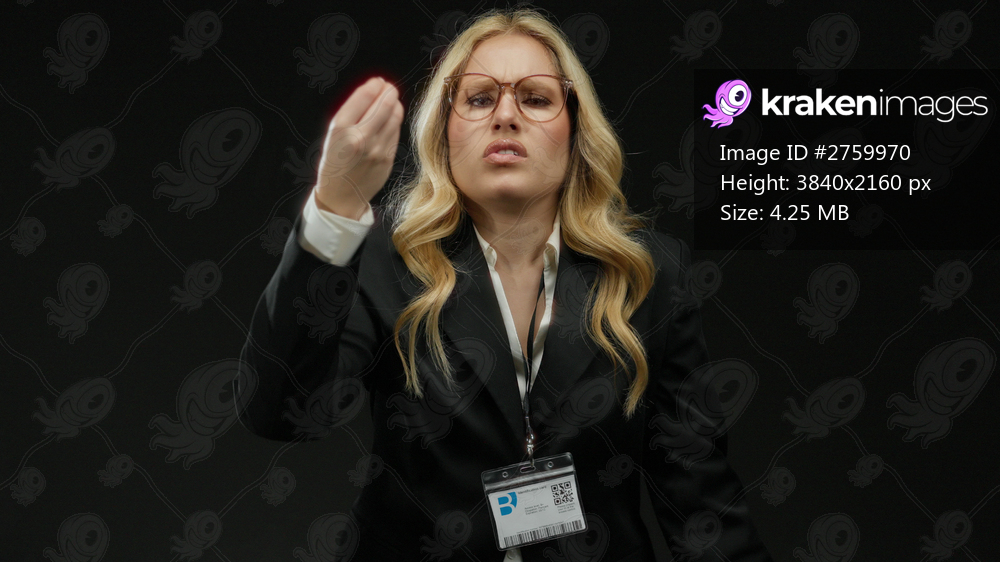 Blonde woman in glasses with id on black background expressing frustration through hand gesture and intense expression.