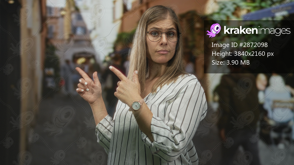 Blonde woman in glasses pointing finger down narrow cobblestone street beside outdoor cafe tables; uncertainty.
