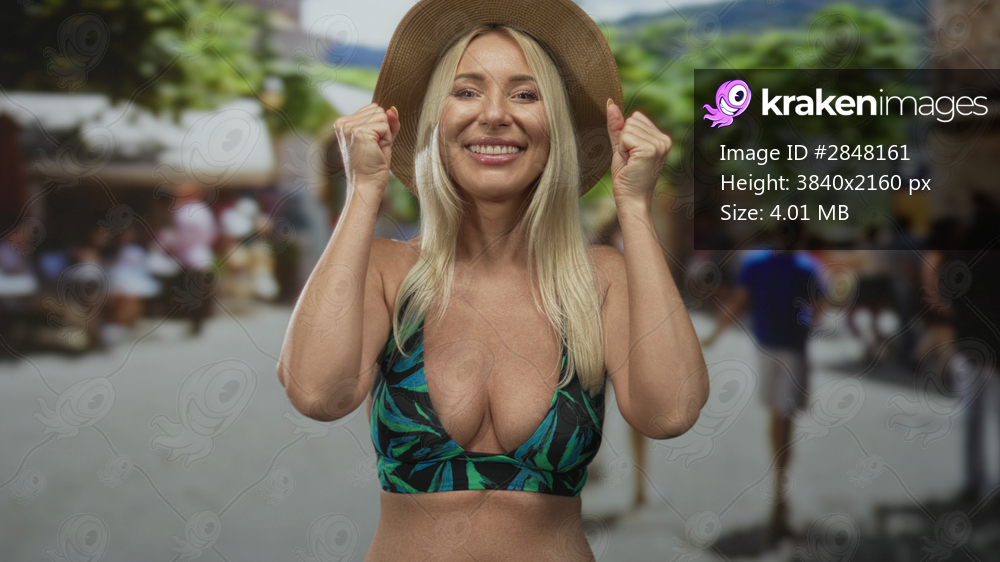 Blonde woman in green bikini top shows cleavage and clenched fists near face on street; celebration joy.
