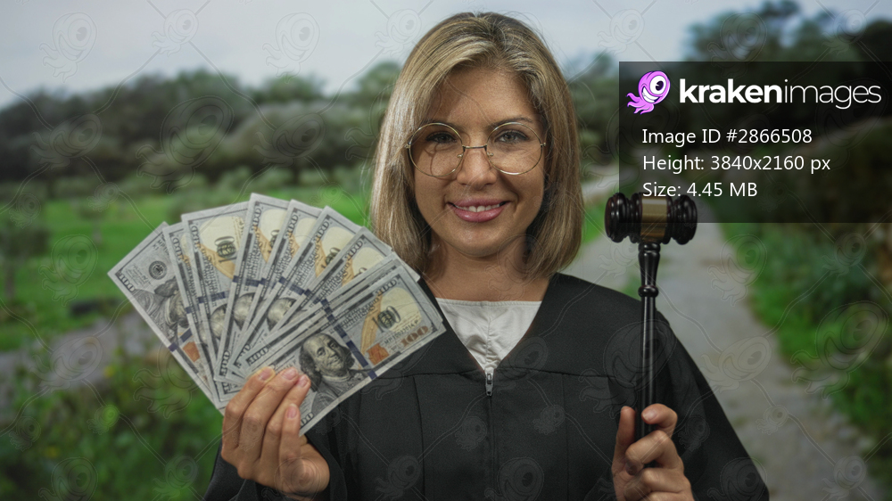 Blonde woman in judge robe holds gavel and fan of dollars in lush dense forest while smiling knowingly; corruption scandal greed bribery.