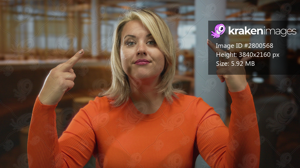 Blonde woman in orange sweater points finger to head and smirks in busy restaurant interior; insight reflection creativity inspiration.