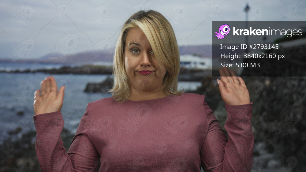 Blonde woman in pink blouse shrugging with raised hands on street by seaside wall; calm indifference.